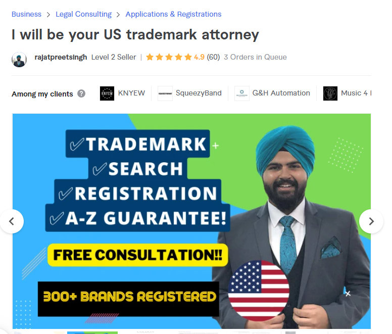 该公司负责人“Rajatpreet Singh Modi”在Fiverr网站上发布称其可以成为您的美国商标代理人,其是一位经验丰富的合同和商标律师,拥有 7 年以上的经验和 300 多次成功的商标注册。