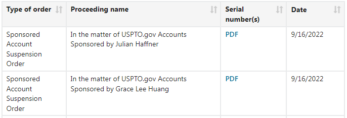 自美国专利商标局 (USPTO)发布强制性验证商标申请人身份验证政策实施已经过去一个多月,近日美国专利商标局 (USPTO)公布了两则赞助账户暂停令,关于由 Julian Haffner、Grace Lee Huang赞助的 USPTO.gov 账户暂停的公告。
