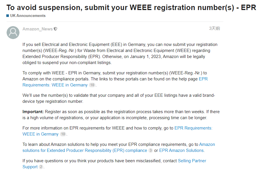 近日亚马逊卖家论坛更新一则公告,公告内容主要是提醒在德国销售电气和电子设备 (EEE)的卖家为了避免亚马逊暂停您的不合规商品,请在2023年1月1日前,提交有关扩展生产者责任 (EPR) 的电气和电子设备 (WEEE) 废物的注册号 (WEEE-Reg.-Nr.)。