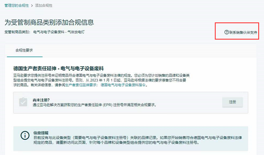 如果选择类别后,显示信息提醒,证明您没有销售该类型产品,此时您需要检查WEEE注册号的注册类型与您目前售卖的产品类型是否匹配,或者点击“联系销售伙伴支持”,获得销售伙伴支持的帮助。