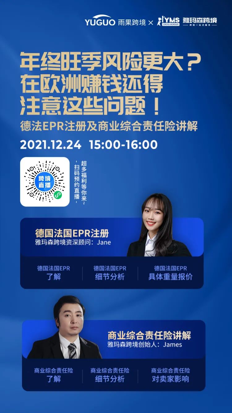 年终旺季风险更大,欧洲赚钱还得注册德法EPR及商业综合责任险,12月24日15:00-16:00锁定雅玛森跨境,联合雨果跨境直播