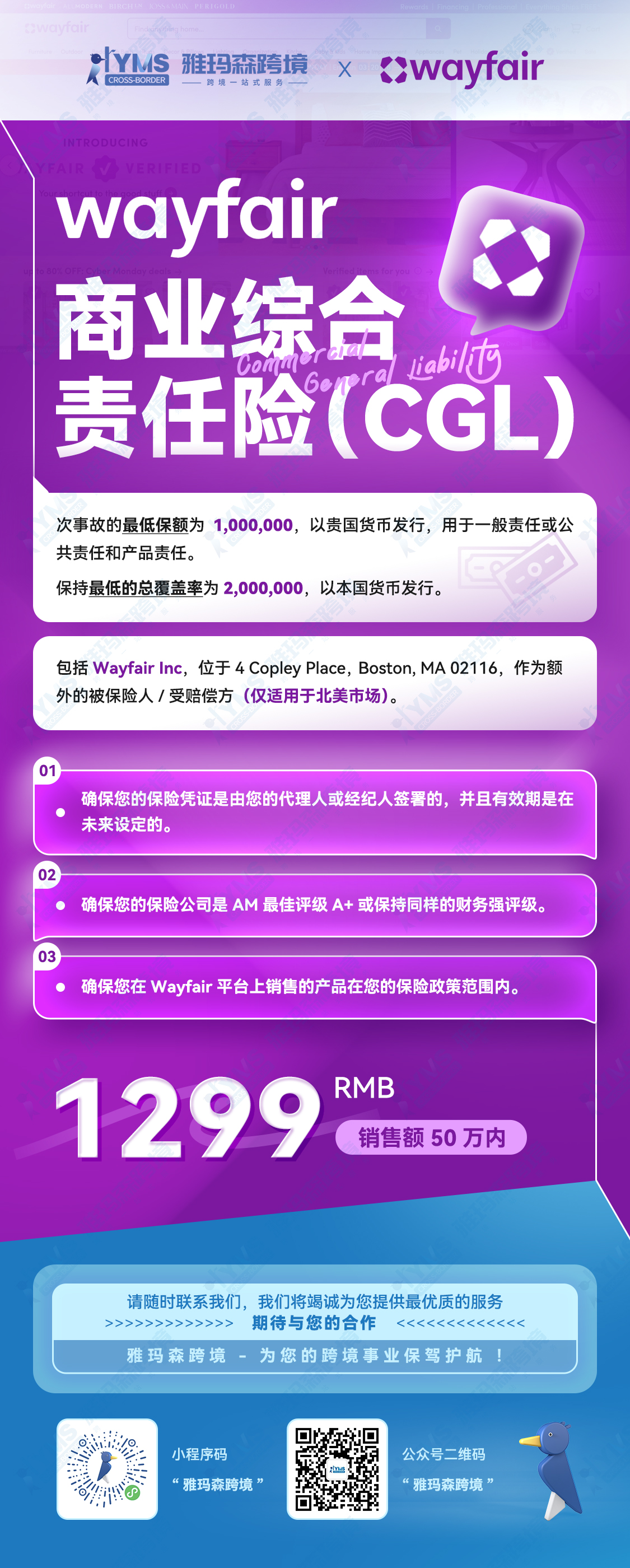 针对Wayfair等跨境电商平台,商业综合责任险尤为重要,平台通常会强制要求卖家购买,以维护自身和消费者权益: