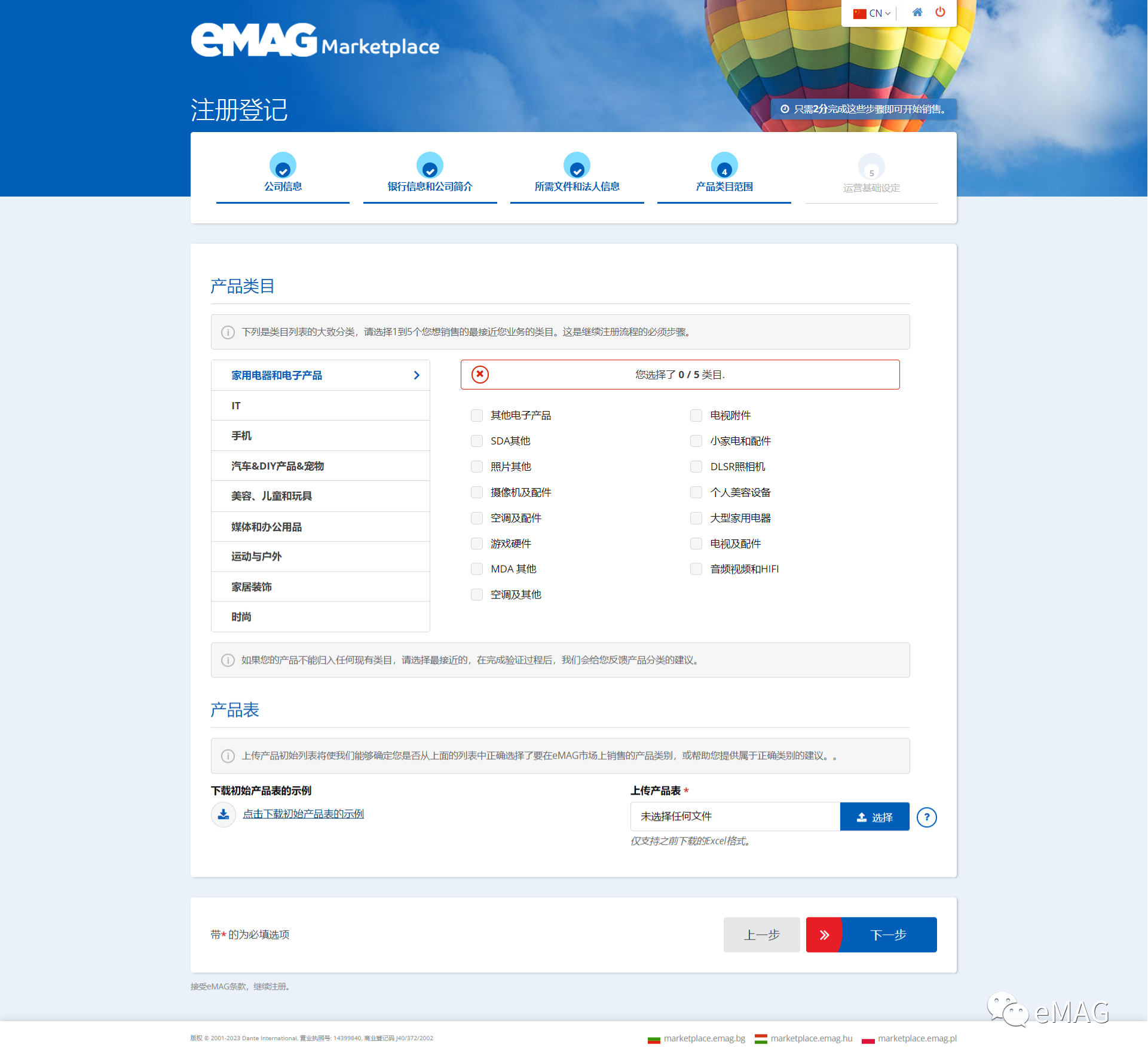 选择销售的产品类型,最多选择5个(该数据只是前期的一个参考,店铺可售多类产品),下载并上传产品表示例。