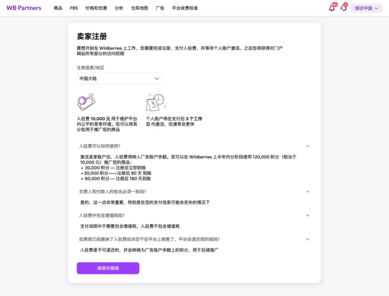 支付后,请等待个人账户的激活。此过程需要最多 3 个工作日,但通常会更快。之后,您将能够访问 seller.wildberries.cn 的所有内容。