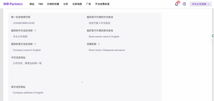 店铺名称 -您的店铺名称,将显示给买家。可以用英语或俄语填写,不可以使用中文。请注意,不可以使用WB,wildberries或相关名称命名,也请注意不要使用其他涉及侵权的名称。