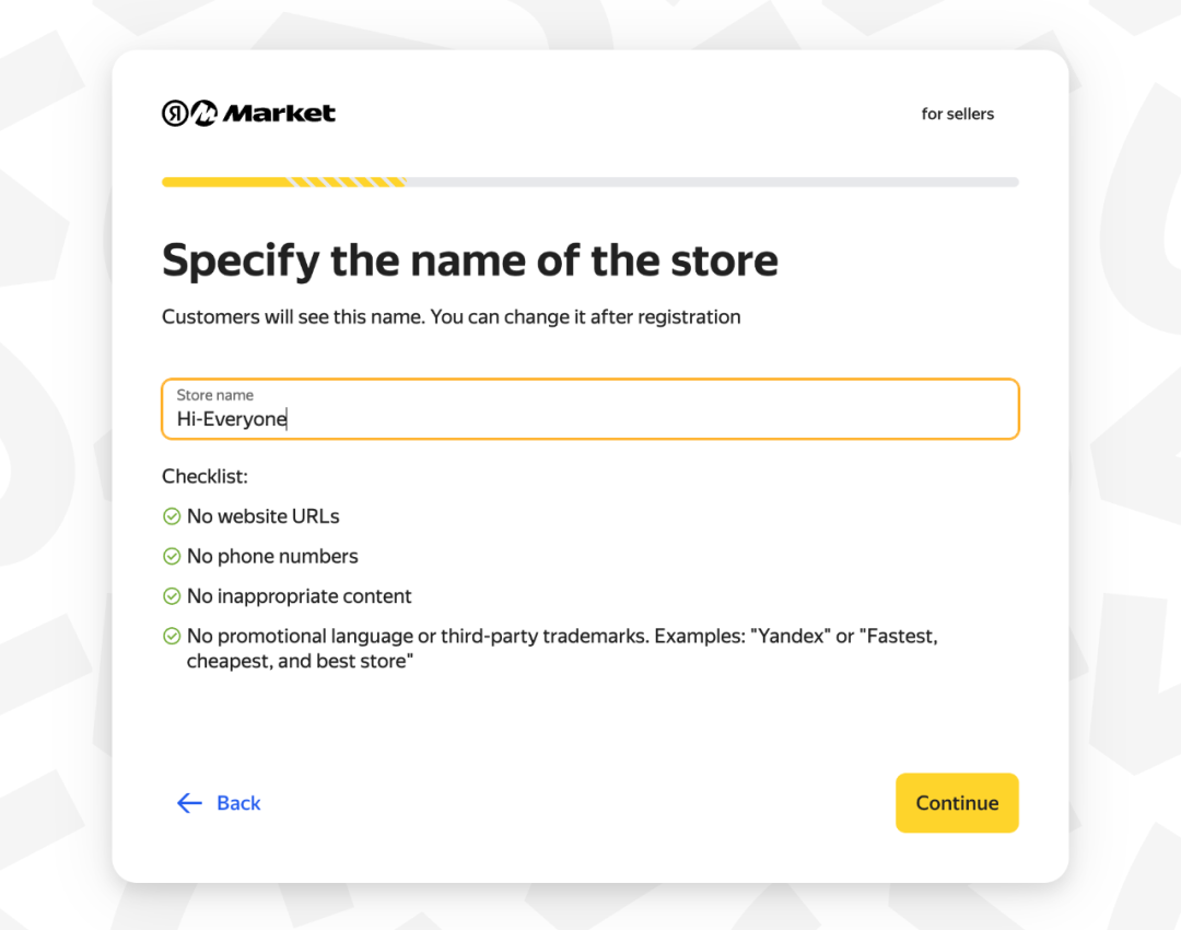 给你的新店铺取一个名字,店铺名字只能是英文或俄文。我这里填写的店铺名是“Hi-Everyone",点击“Continue-继续”