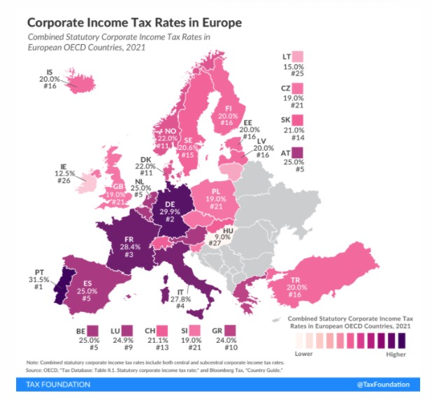 爱尔兰对所有企业营业利润统一征收12.5%的所得税,且对企业不实行郡、市等地方级税赋。相比于欧盟大部分国家30-40%不等的公司税,爱尔兰的企业所得税要优惠得多,这在发达国家中是极为少见的,也由此使爱尔兰对跨国公司投资有很大的吸引力。爱尔兰公司税支付体系非常完善,在欧洲国家纳税便利度排名第一,全球第六。